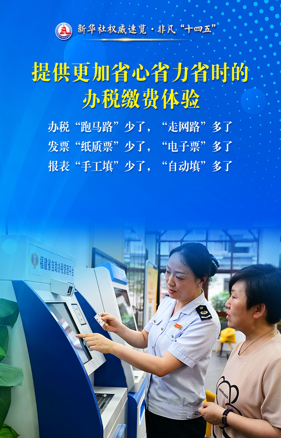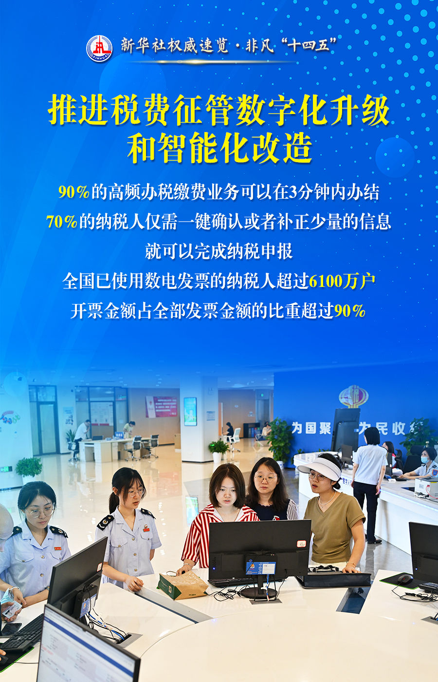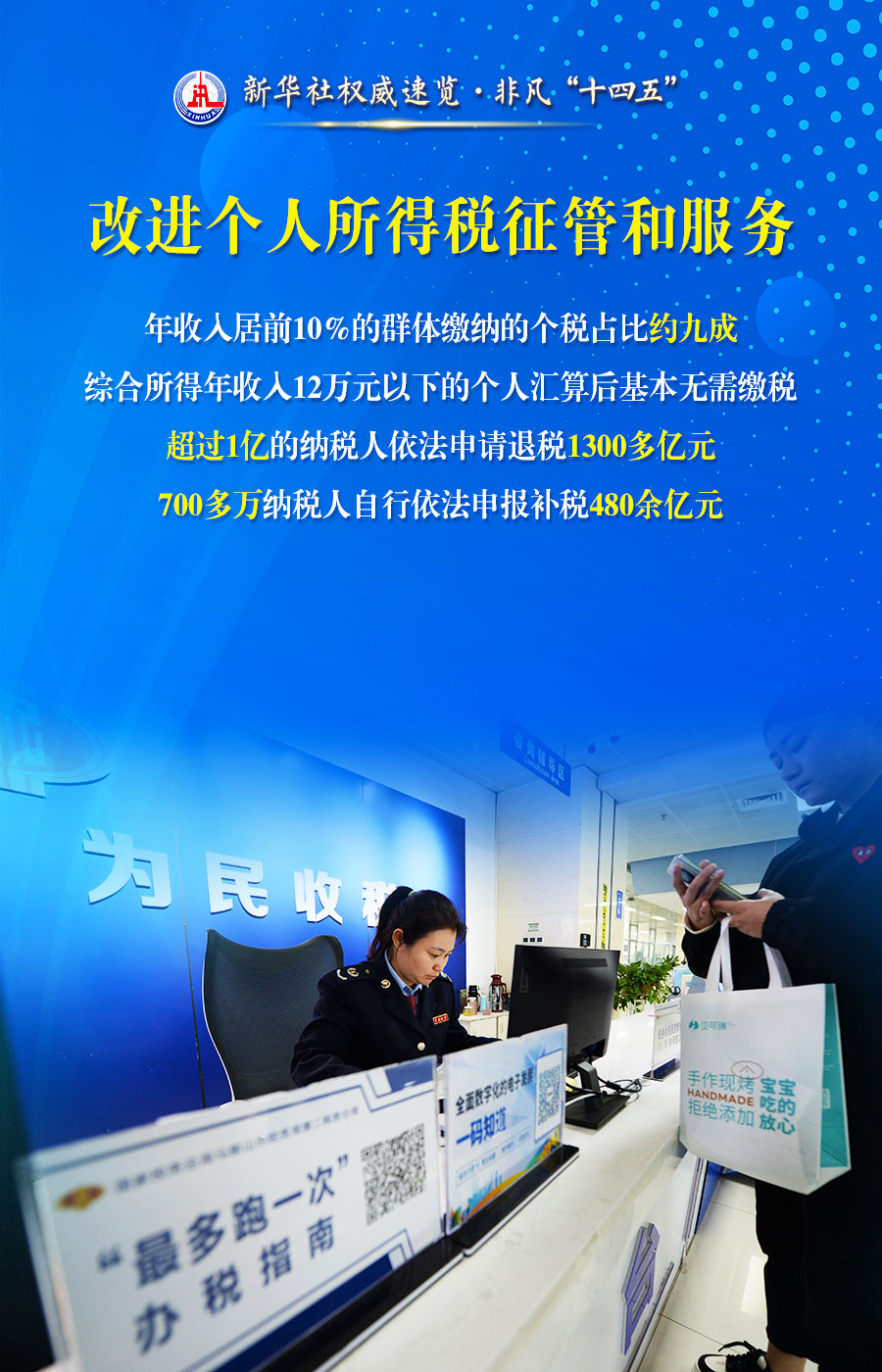 首页 新闻动态 媒体视点 媒体视点 索引号 主题分类 发文机关 标题 发文字号 发布时间 废止日期 税收服务高质量发展,税务部门这么干! 发布时间:2025-07-29 来源:新华社 字号:[ 大 ][ 中 ][ 小 ] 打印本页 下载 超过1亿人享受专项附加扣除、全国累计新增减税降费今年将达到10.5万亿元、90%的高频办税缴费业务可以在3分钟内办结......28日举行的“高质量完成‘十四五’规划”新闻发布会上,国家税务总局介绍“十四五”时期税收服务高质量发展的情况。通过这组海报,一起来看。 扫一扫在手机打开当前页